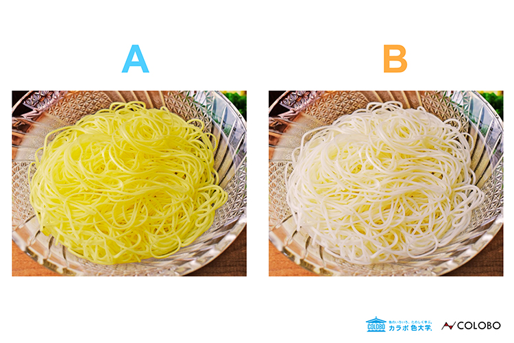プロジェクタで黄色と白の麺を映し出し、参加者に「なんの麺に見えるか?」と尋ねたところ、Aは「ラーメン/中華麺」Bは「そうめん」という回答に。